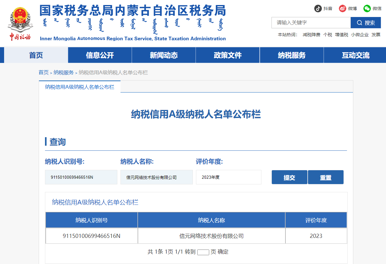 近日,国家税务总局公布了2024年度纳税信用等级评价结果,信元网络技术股份有限公司凭借规范高效的税务管理、诚信守法的企业担当,连续三年荣获“A级纳税人”荣誉称号!这一殊荣不仅是国家税务机关对信元网络技术股份有限公司长期以来坚持依法纳税的权威认可,更是企业综合实力与社会责任的生动体现。